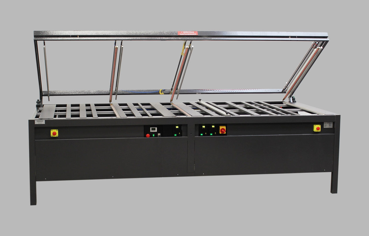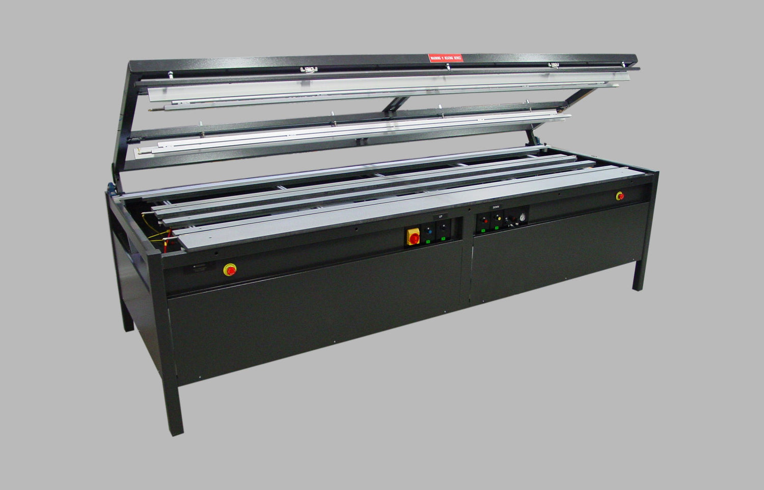 The time controlled upper frame has adjustable pressure bars that hold the plates in place and prevent warping (banana effect). The upper frame is controlled by a foot pedal and timer switch.