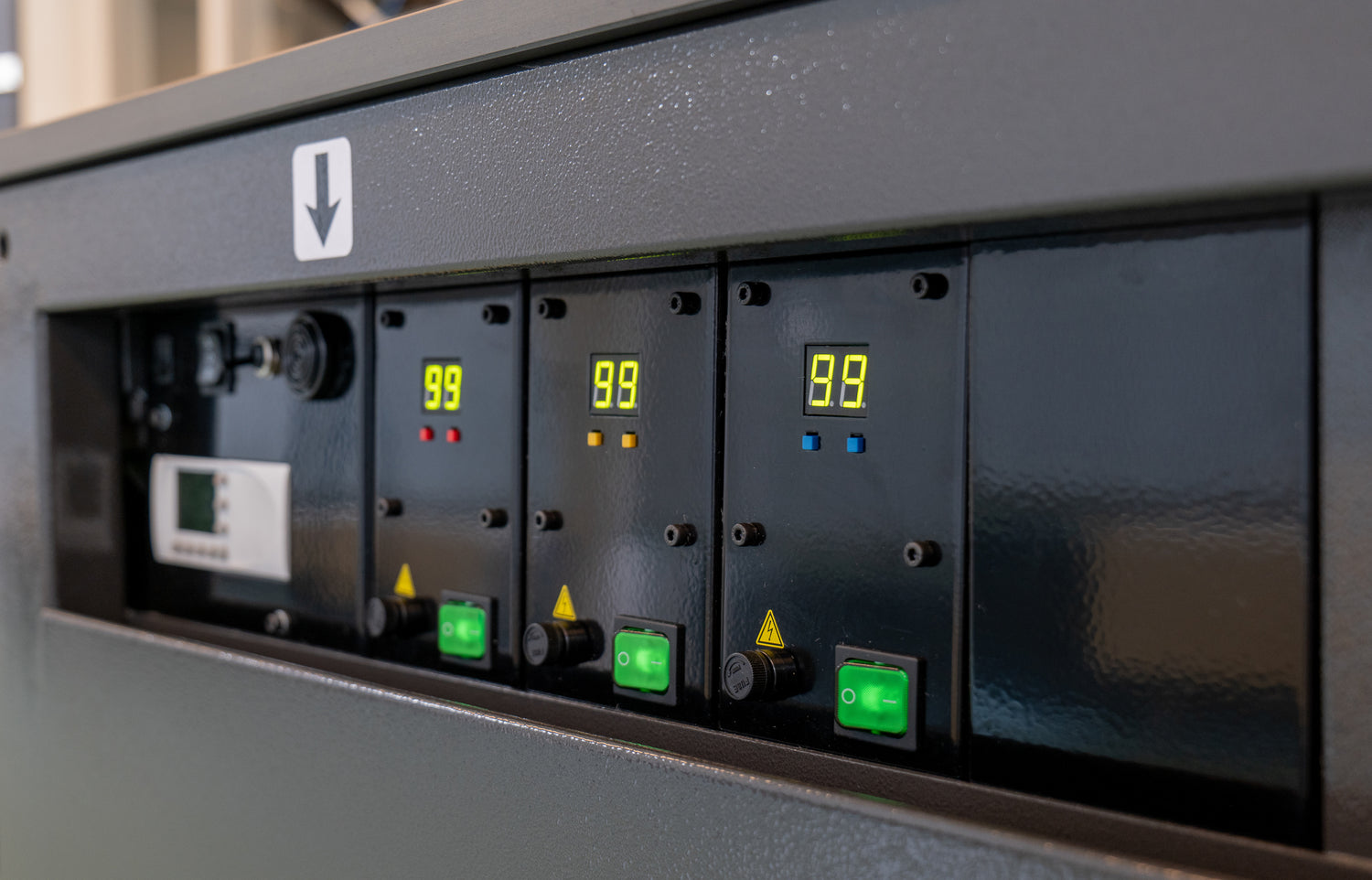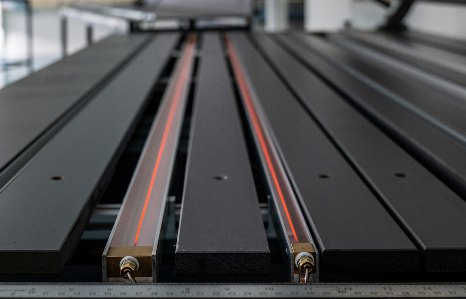 The durable heat resistant worktop consists of multiple adjustable panels and has a parallel stop with millimetre and inch indication. The machine is modular built and is already prepared internally so that it can be easily extended with multiple heating profiles and/or control units.
